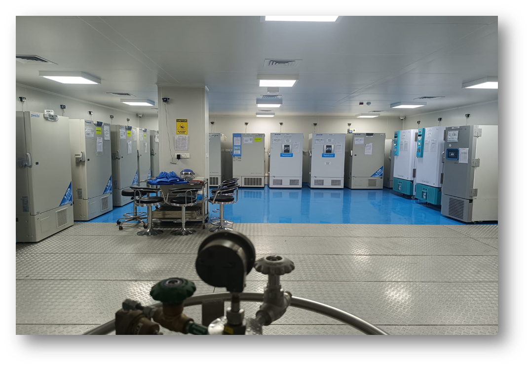 The Department has a large, state-of-the-art TB Biorepository, that is well-equipped with essential infrastructure to undertake storage of different types of biological specimens, and is provided with all safety devices like access control, CCTV surveillance, carbon dioxide monitors, fire alarms and fire extinguishers to ensure the safety of the stored specimens. All storage equipment are connected to real-time temperature monitoring devices to ensure sample integrity. Chain of custody and sample inventory management at the Biorepository are implemented through the cloud-based Freezer Pro Specimen Management System.